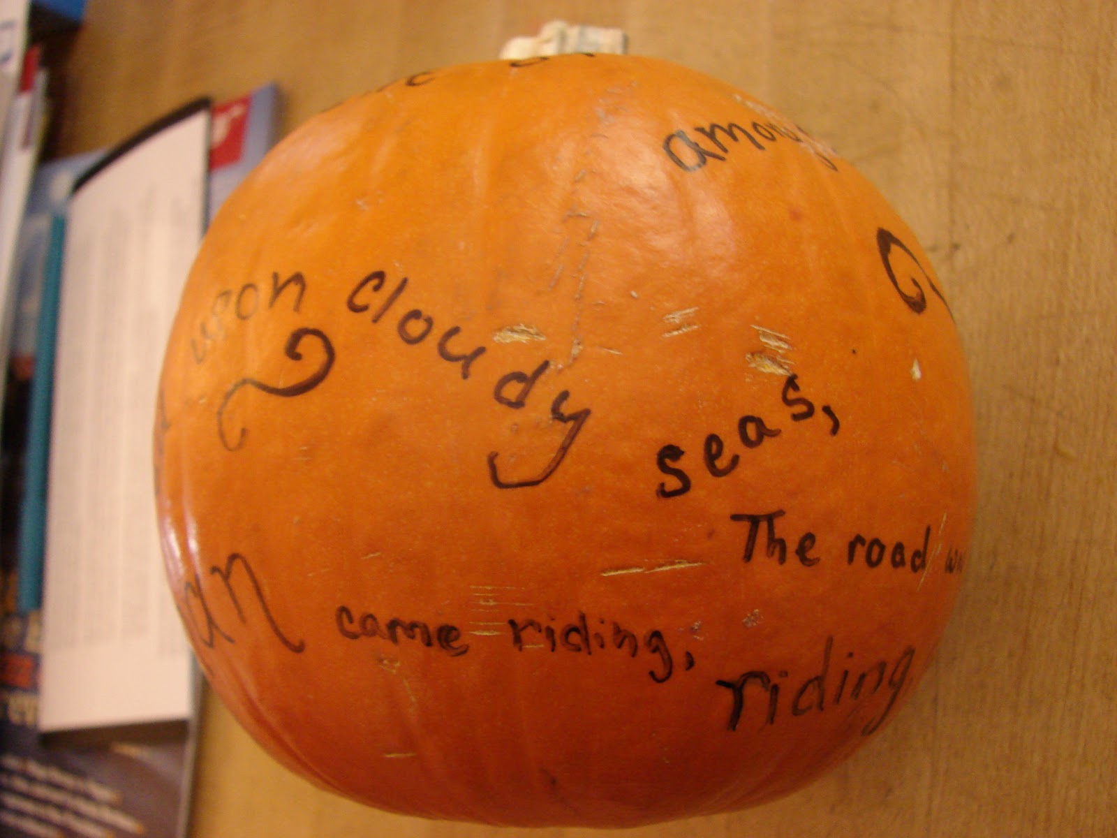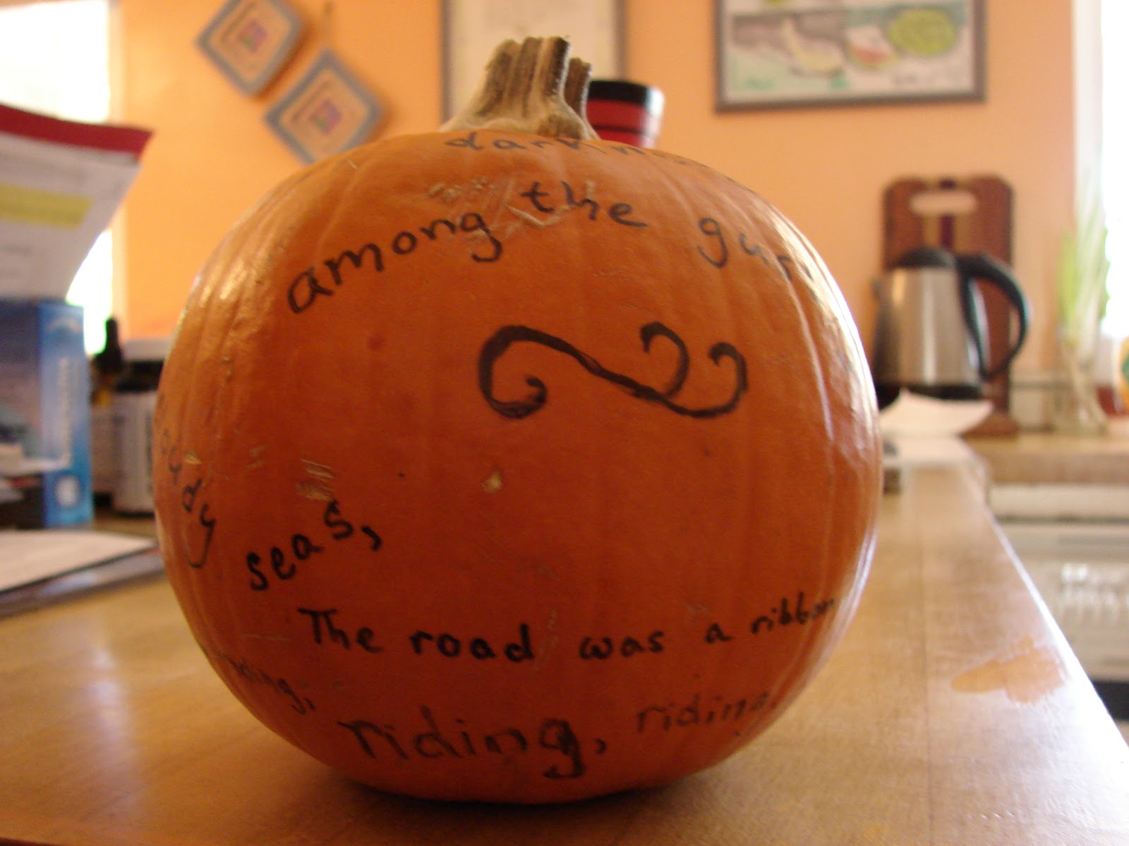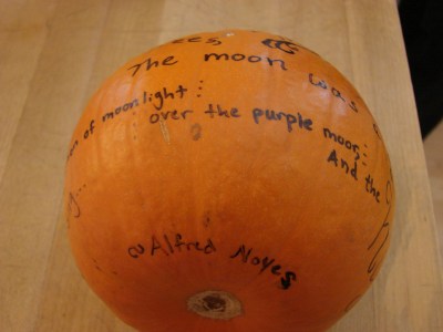 These famous opening lines spiral consecutively around the pumpkin, creating both a ghostly ambience and celebrating the beauty of words.