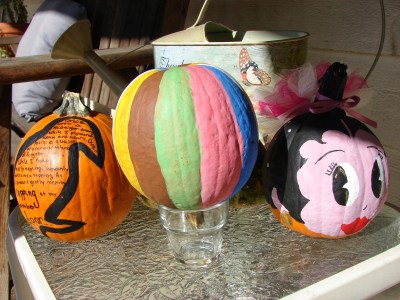 But at my house, there being neither babies nor dogs to dress up, we paint real pumpkins. One of the vegetables below was designed by the engineer, one by the artist, and one by the writer in the house. I’ll let you guess whose is whose.