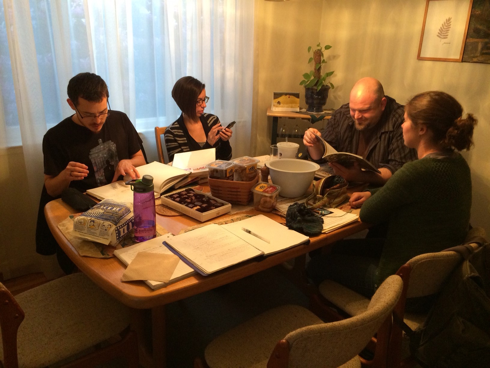 A calligraphy artist, a painter, a video game designer, a knitwear designer, and a writer sat around a table, ate cookies, talked about canvas stretching and fountain pen brands, made geeky jokes, and occasionally fell silent to be productive.