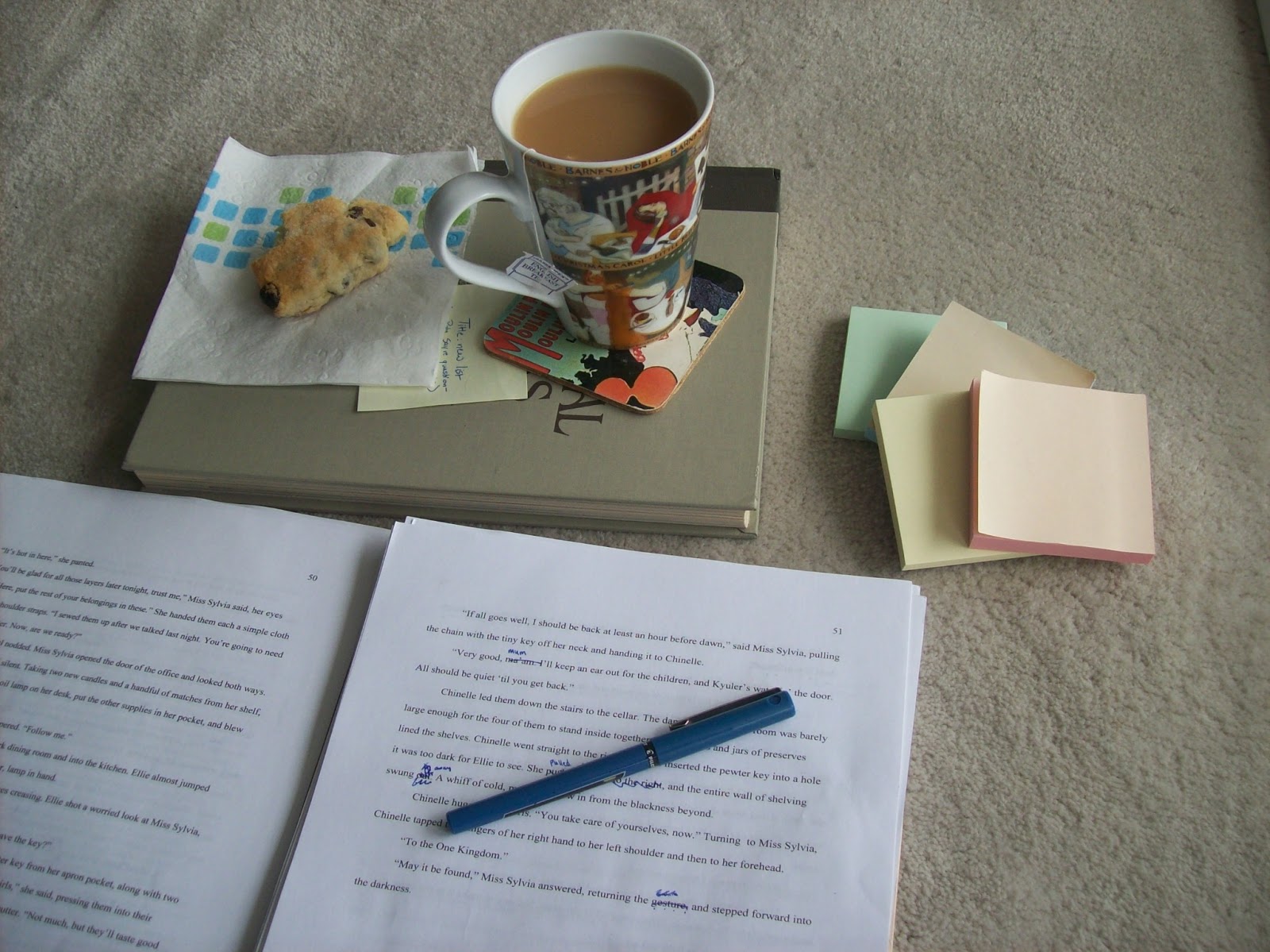 Third ingredient: English tea. Yesterday I even got lucky and found a scone to go with it. Tea, scone, post-its, favorite pen, and double-spaced manuscript. Perfect recipe for a productive novel-writing afternoon.